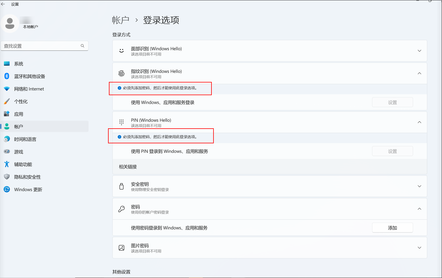 若您要使用Windows Hello相关功能,“必须先添加密码,然后才能使用此登录选项”,如下图所示: