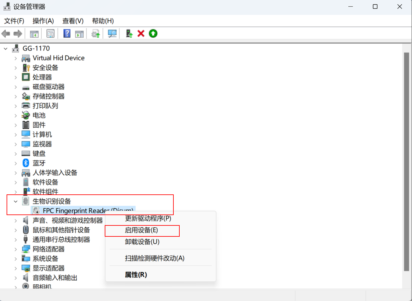 - 请在笔记本任务栏搜索框,搜索设备管理器打开,选择生物识别设备,右键点击指纹/人脸驱动,选择启用设备(下图以指纹驱动为例)。