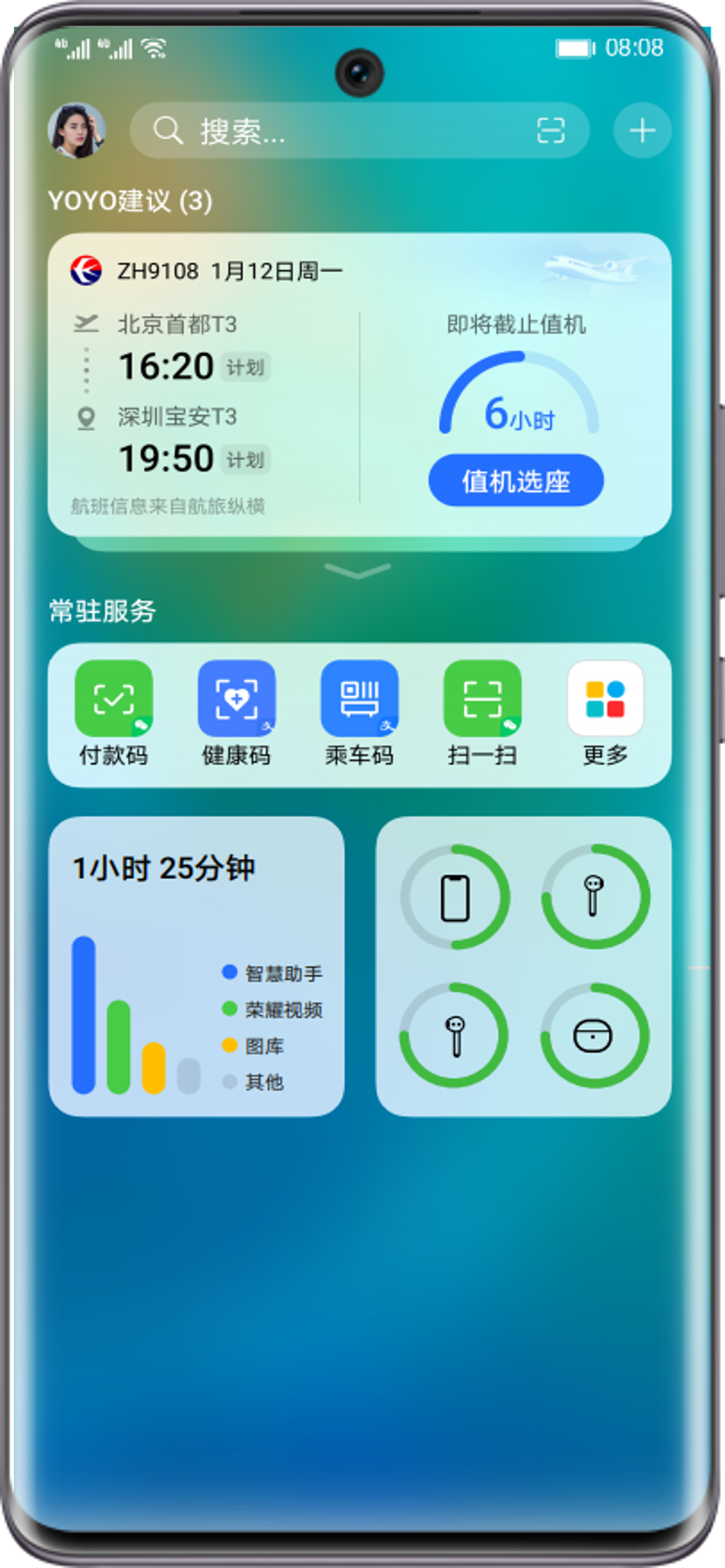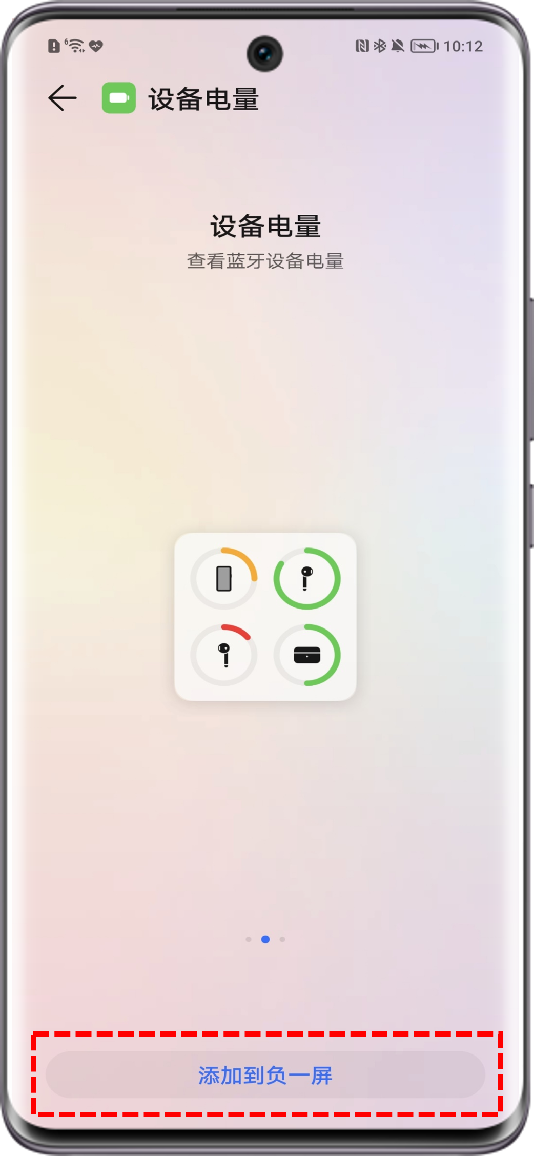 负一屏电量卡片可以在您使用蓝牙耳机、蓝牙眼镜等设备时,展示设备的实时电量信息。