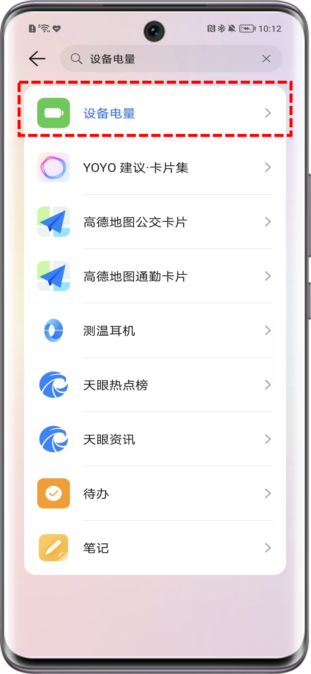 添加方法:负一屏>右上角“+”进入荣耀快服务>搜索并点击“设备电量”>选择合适尺寸后点击“添加到负一屏”。