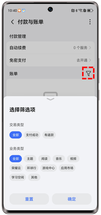 设置>登录荣耀账号>账号中心>荣耀钱包/付款与账单