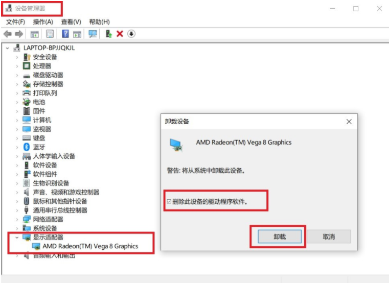 - 卸载完成后,在任务栏的搜索框输入设备管理器并点击进入,找到显示适配器,展开后,右键点击卸载AMD Radeon显卡设备,并勾选删除此设备的驱动程序软件,卸载完成后关机重启。