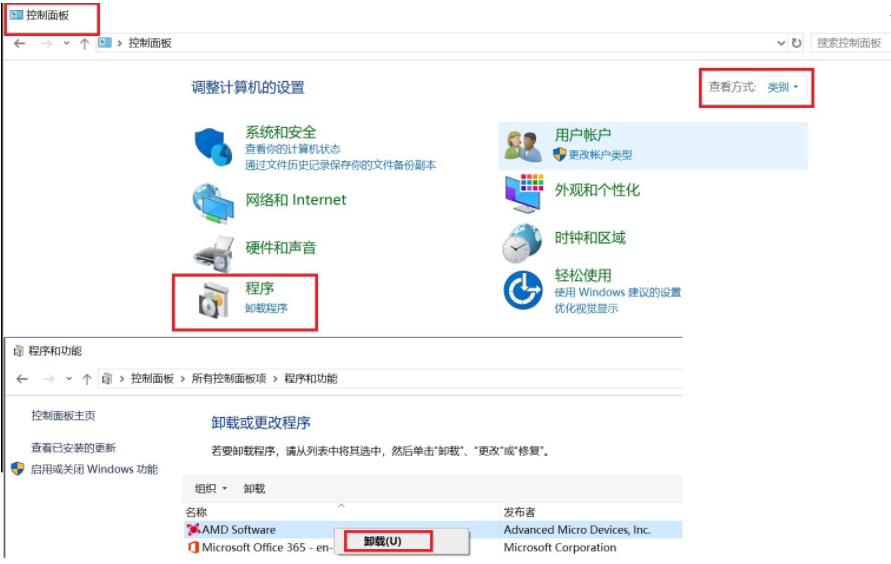 - 进入安全模式后,在任务栏的搜索栏输入控制面板并点击进入,右上角查看方式选择类别,点击卸载程序,右键点击卸载AMD Software和AMD Radeon Settings应用。