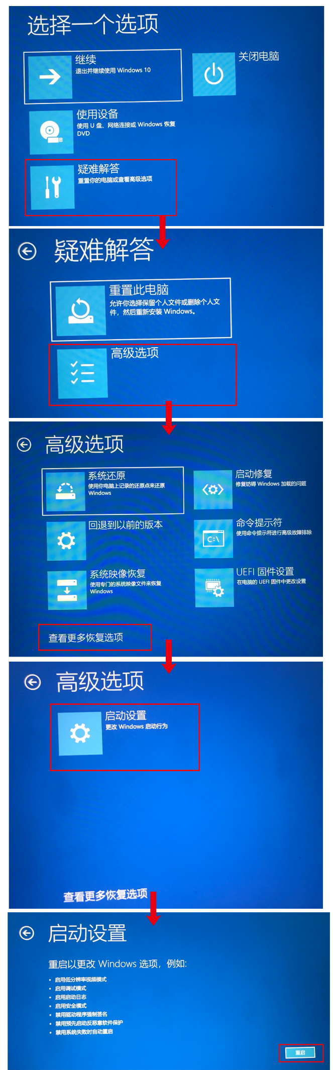 - 重启开机时长按或点按 F8 按键,在弹出的选项界面中点击疑难解答,再依次点击高级选项> 查看更多恢复选项>启动设置>重启(也可查看此路径:点击高级选项>启动设置>重启)。