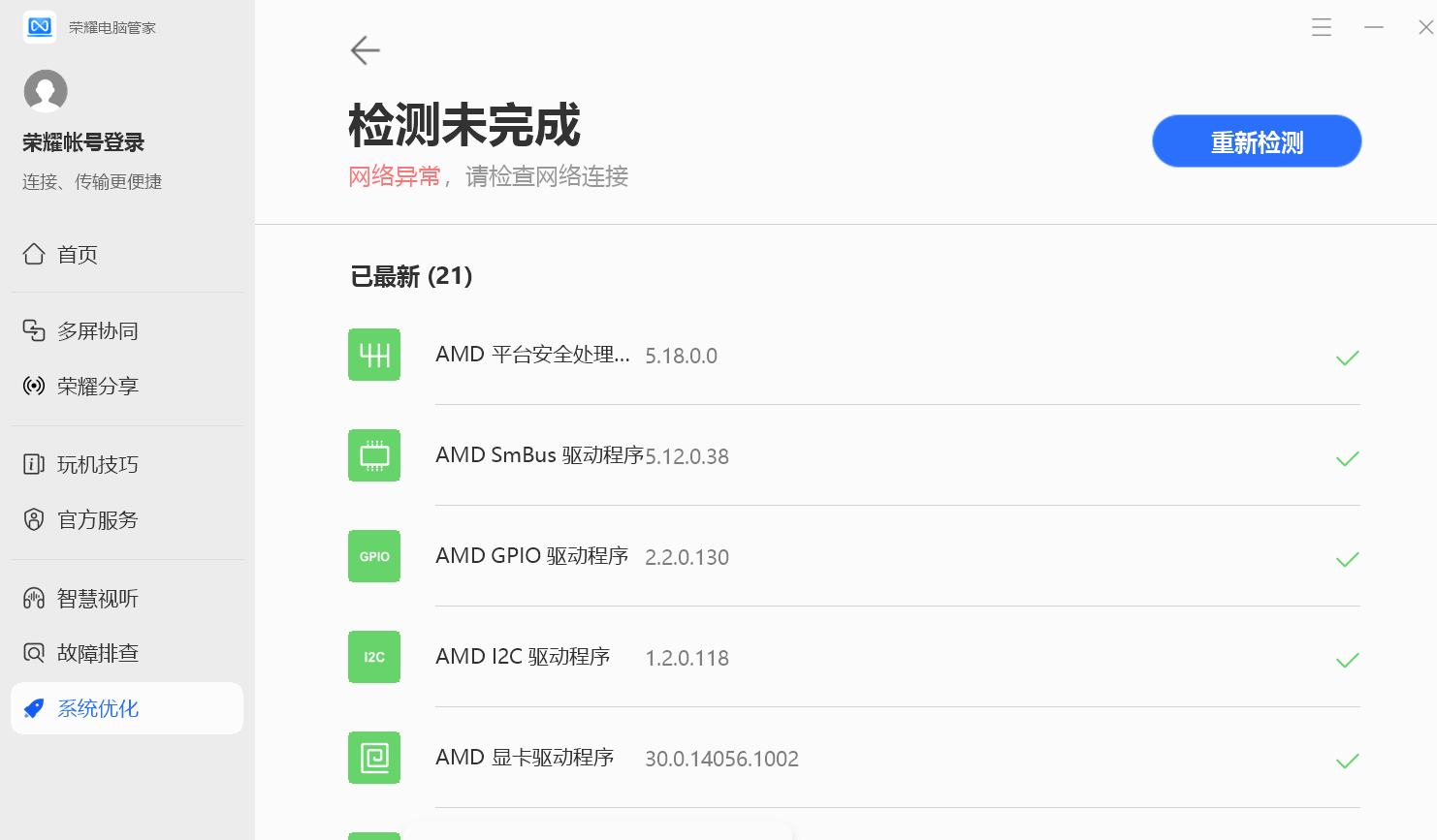 AMD官网和AMD显卡控制面板中推送更新的驱动,均未经过荣耀验证测试,不建议自行下载安装,以防这些驱动在您的计算机上出现兼容性问题。为了增强计算机的使用稳定性,请在电脑管家更新安装驱动,或在荣耀官网上找到对应机型,下载安装需要的驱动软件。