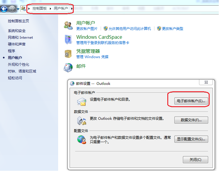 点击桌面Windows图标,在任务栏搜索框输入“控制面板”,再点击控制面板 > 用户帐户 > 邮件,将弹出邮件设置窗口。