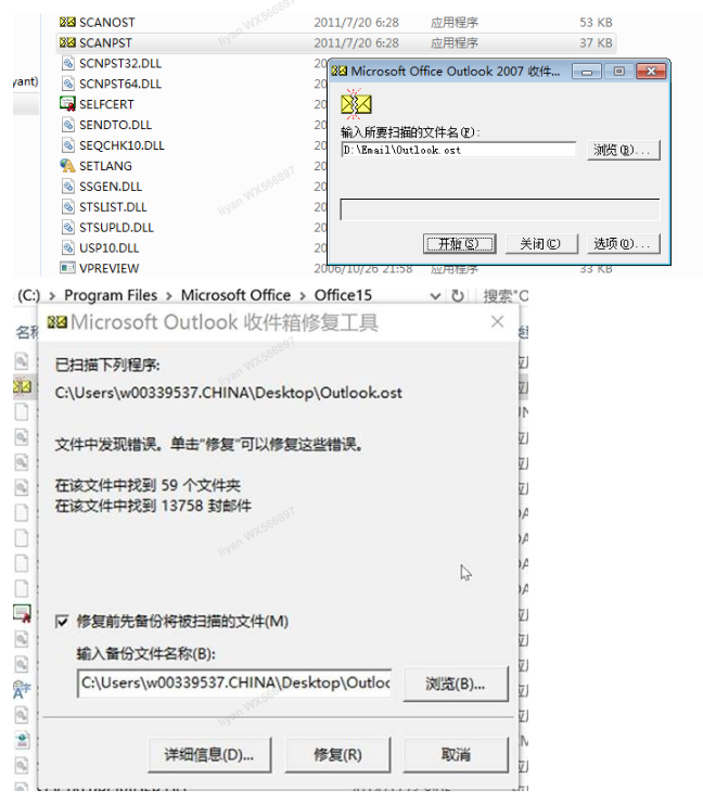 运行步骤1中的 SCANPST.exe,并输入步骤2中找到的 Outlook.ost 路径点击“开始”进行扫描。若发现有错误,则点击修复。