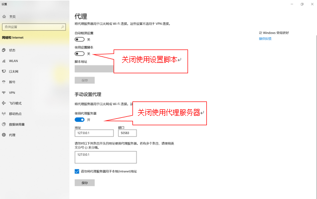- 点击开始菜单>设置>网络和Internet>代理>清除手动代理设置(如下图所示两个设置)。