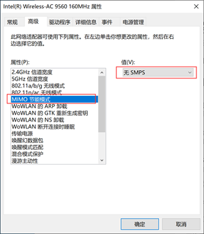 - 在属性中选择高级,在高级中找到MIMO节能模式,选择无SMPS配置,点击确定即可。