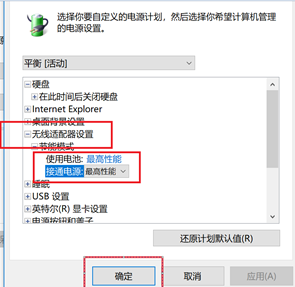 - 在无线适配器设置选择节能模式中的使用电池及接通电源都改成最高性能,然后重启计算机。