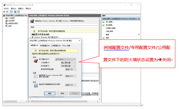 - 打开控制面板>系统和安全>Windows Defender 防火墙>高级设置>高级安全Windows defender防火墙设置>属性>将域配置文件/专用配置文件/公用配置文件下的防火墙状态设置为关闭。
