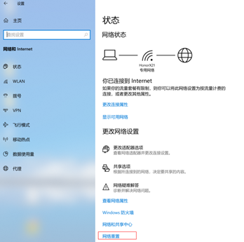 - 重置网络步骤:点击桌面 开始> 设置 > 网络和 Internet > 状态>网络重置;重置网络会导致之前连接过的WiFi密码丢失,需要重新输入密码再次连接。