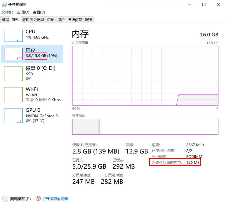 16G内存配置,可以看到为硬件保留的内存为126MB,所以16G的内存可用内存为15.9G。