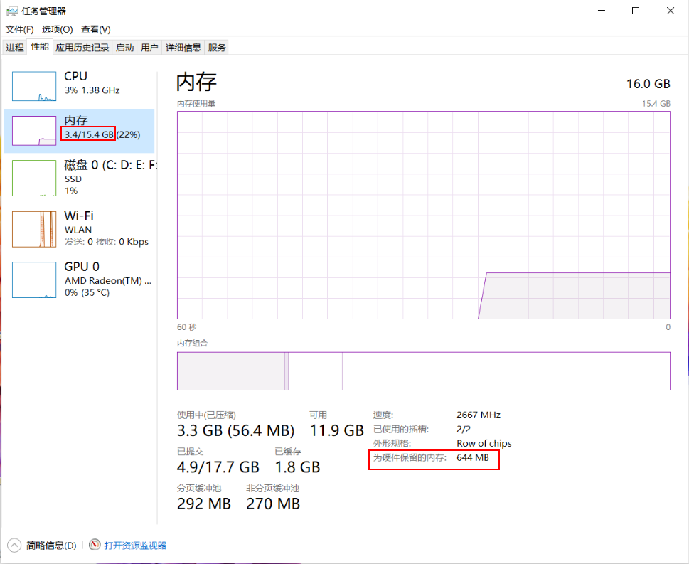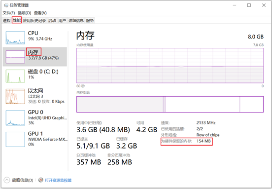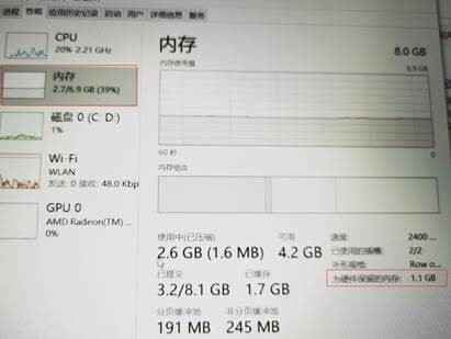 - 内存自身会预留存储空间。在任务栏搜索框中输入“任务管理器”并打开,点击性能 > 内存,您可以看到“为硬件保留的内存”,这个就是内存自身预留的存储空间大小。