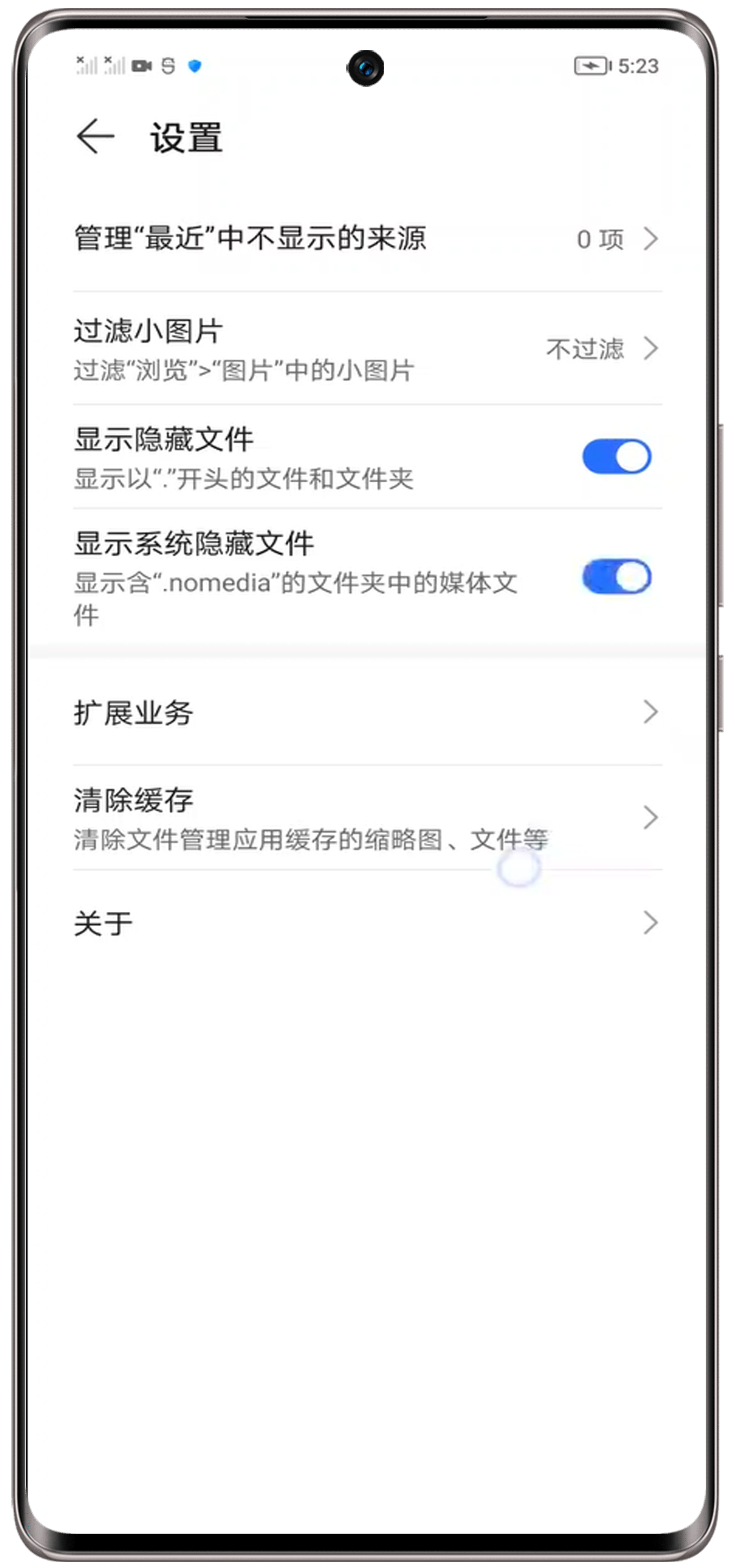 如果您需要查看隐藏文件,可以进入文件管理>右上角三个点>设置,打开“显示隐藏文件”和“显示系统隐藏文件”开关,进入文件管理上方图片/视频中进行查看。