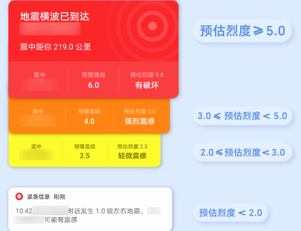 当预估烈度大于或等于 2.0 度时,全屏强提示弹窗将以不同颜色(黄、橙、红)代表不同程度的震感及破坏强度,以最大声音播报倒计时等报警音