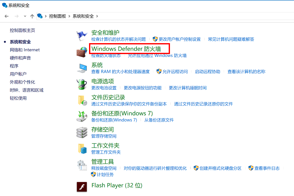 - 点击Windows Defender 防火墙。