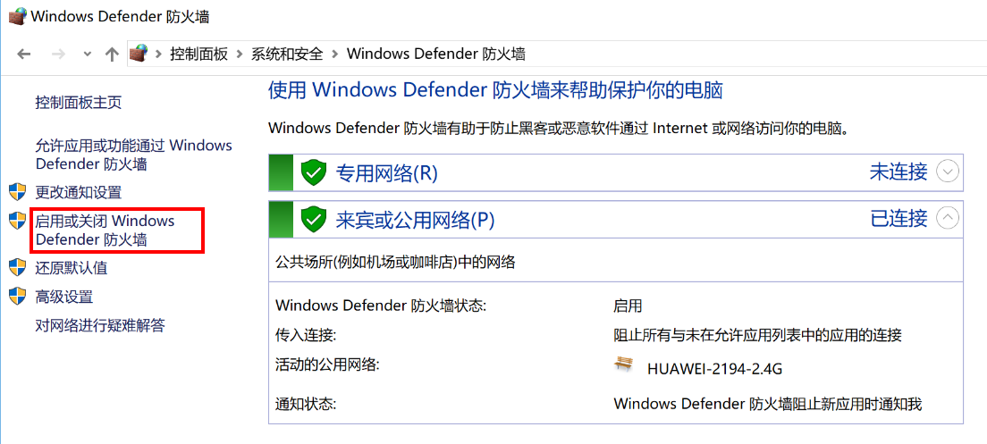 - 点击启用或关闭 Windows Defender 防火墙。