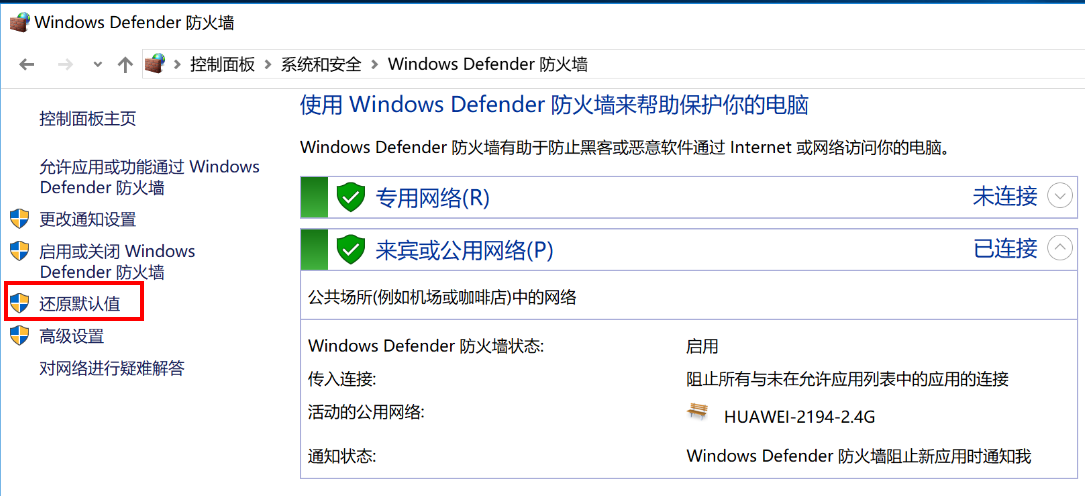 - 若要将Windows 防火墙恢复到默认设置: