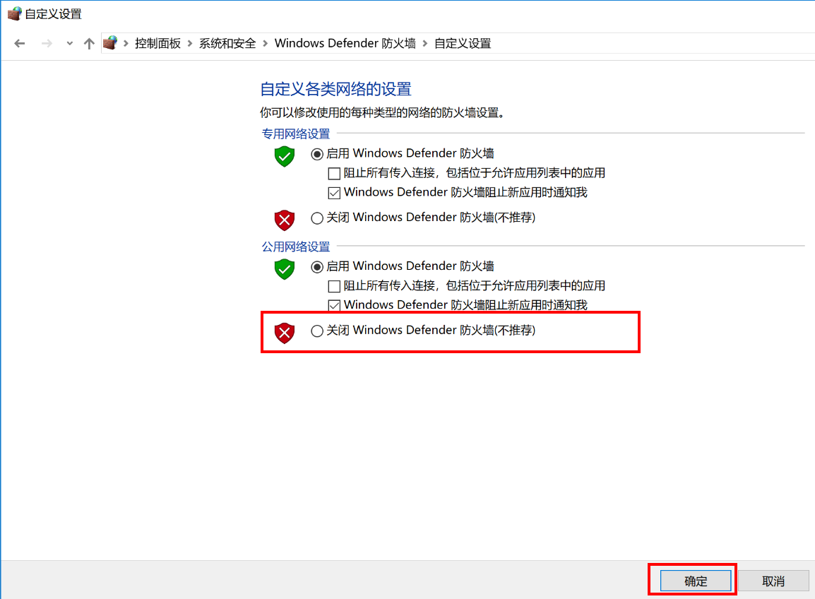 - 选择关闭 Windows Defender 防火墙单选框,点击确定。
