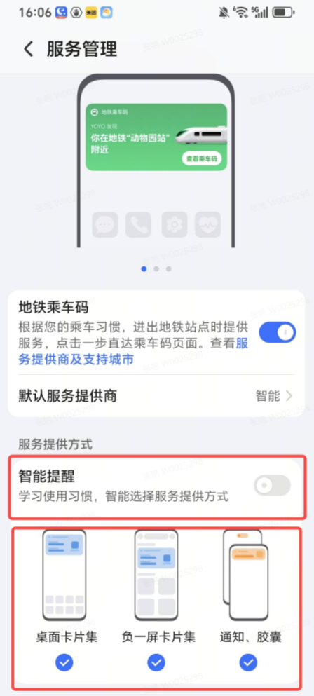 如您需要乘车码提醒,请连续使用一段时间对应App的乘车码,以便YOYO建议学习您的使用习惯,恢复显示乘车码提醒卡片或进入系统设置 > 智慧助手/荣耀AI&YOYO > YOYO建议 > 地铁乘车码 > 关闭‘智能提醒’后,手动勾选桌面卡片集等显示位置。