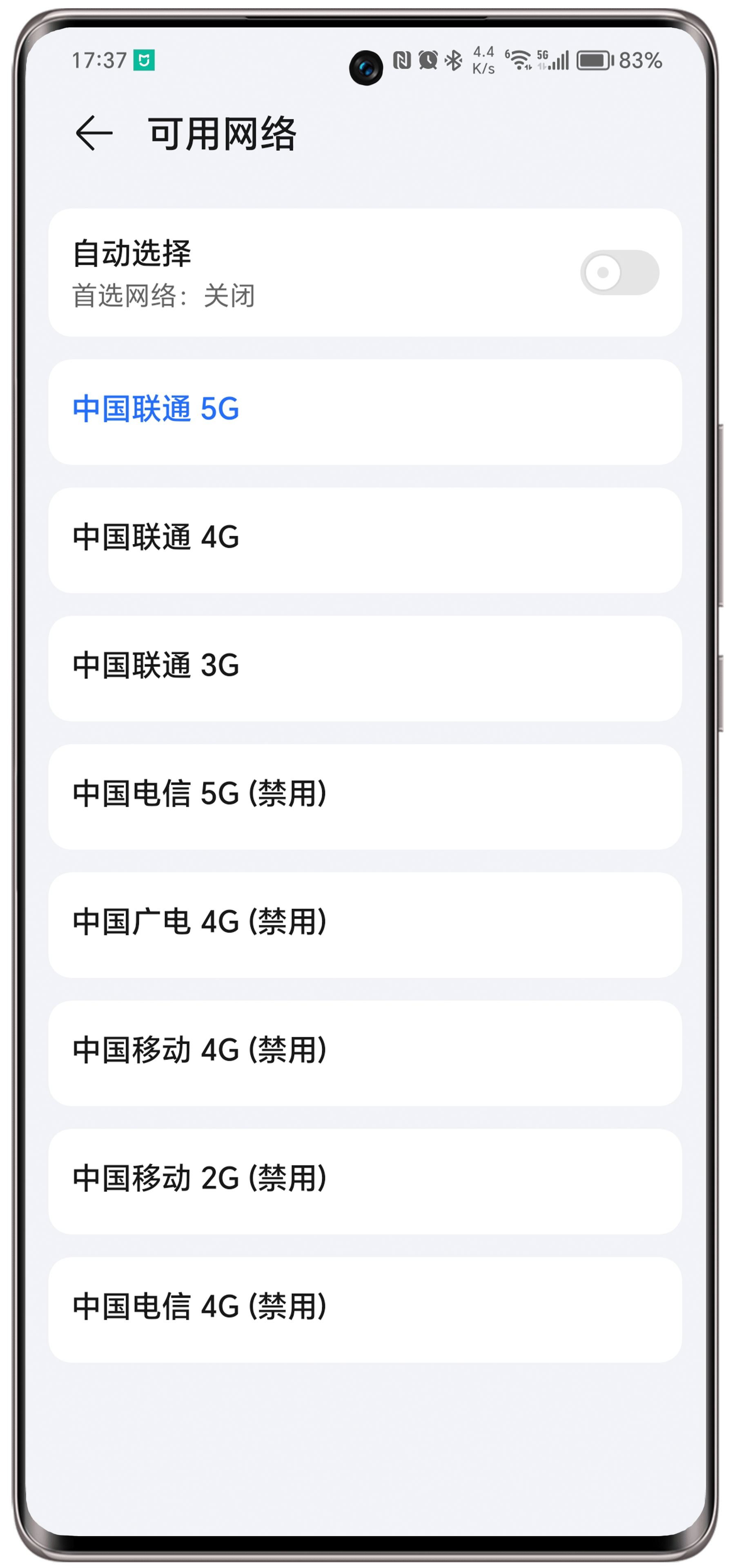 此时显示的是可用网络,与SIM卡的运营商是关联的,SIM卡中配置的禁用网络会显示禁用。例如,移动卡只有中国移动可用,中国联通与中国电信显示禁用是正常的。