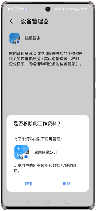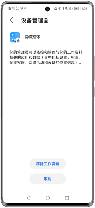 如需移除此开关,进入设置>安全>更多安全设置>设备管理器,找到对应的应用,解除激活或移除工作资料,然后点击删除即可。