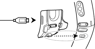 - 请将充电底座上的塑胶定位凸台插入到手环表带定位孔内,并将卡扣扣合牢固。