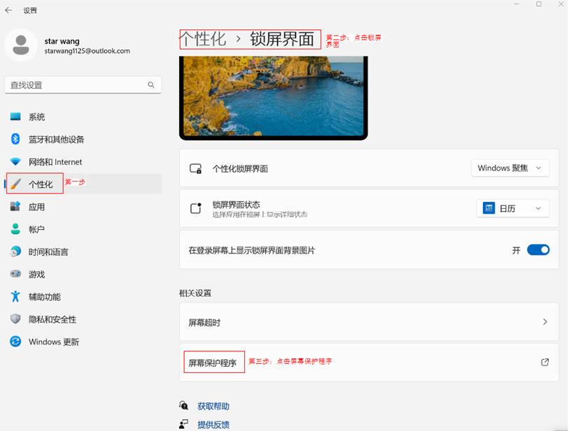 设置>个性化>锁屏界面>屏幕保护程序