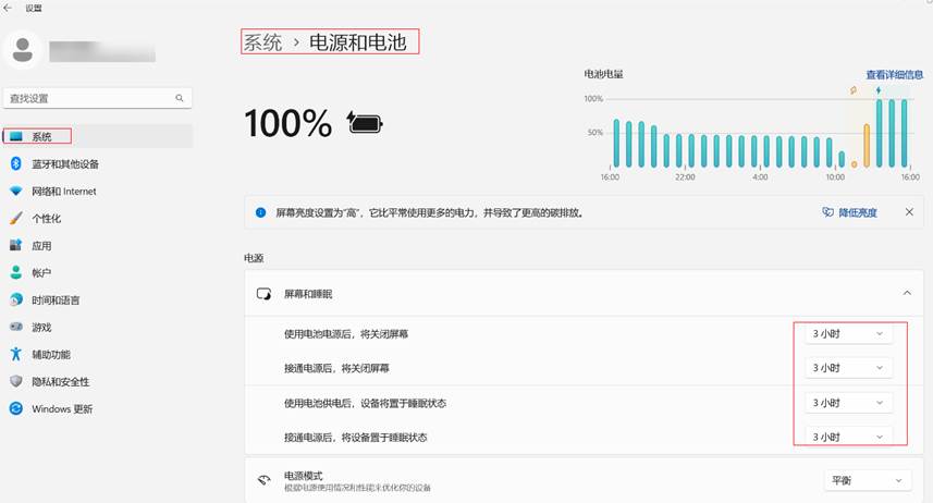 设置>系统>电源和电池>屏幕和睡眠