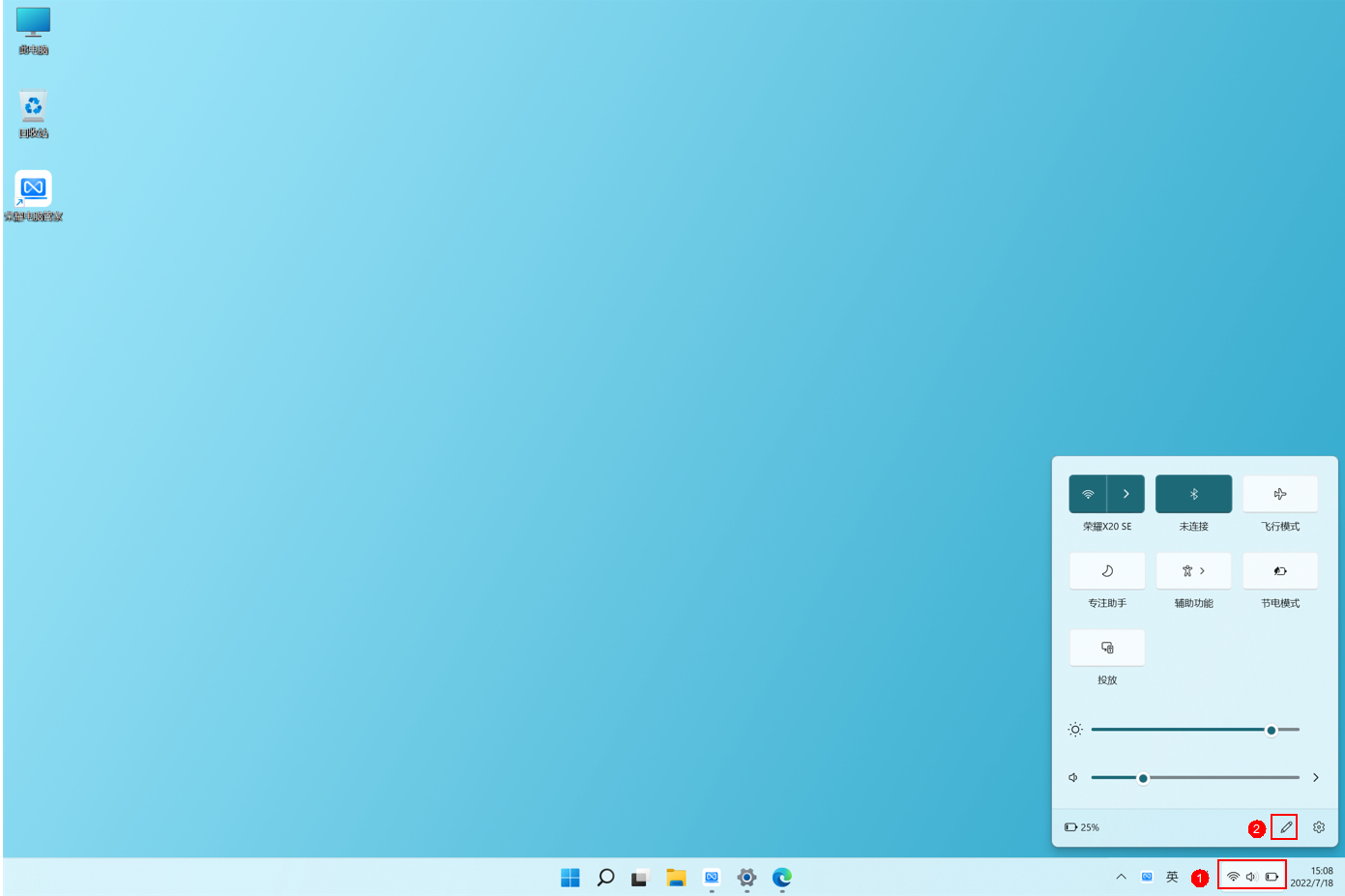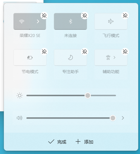 同时按住windows图标+A,打开快速设置面板。