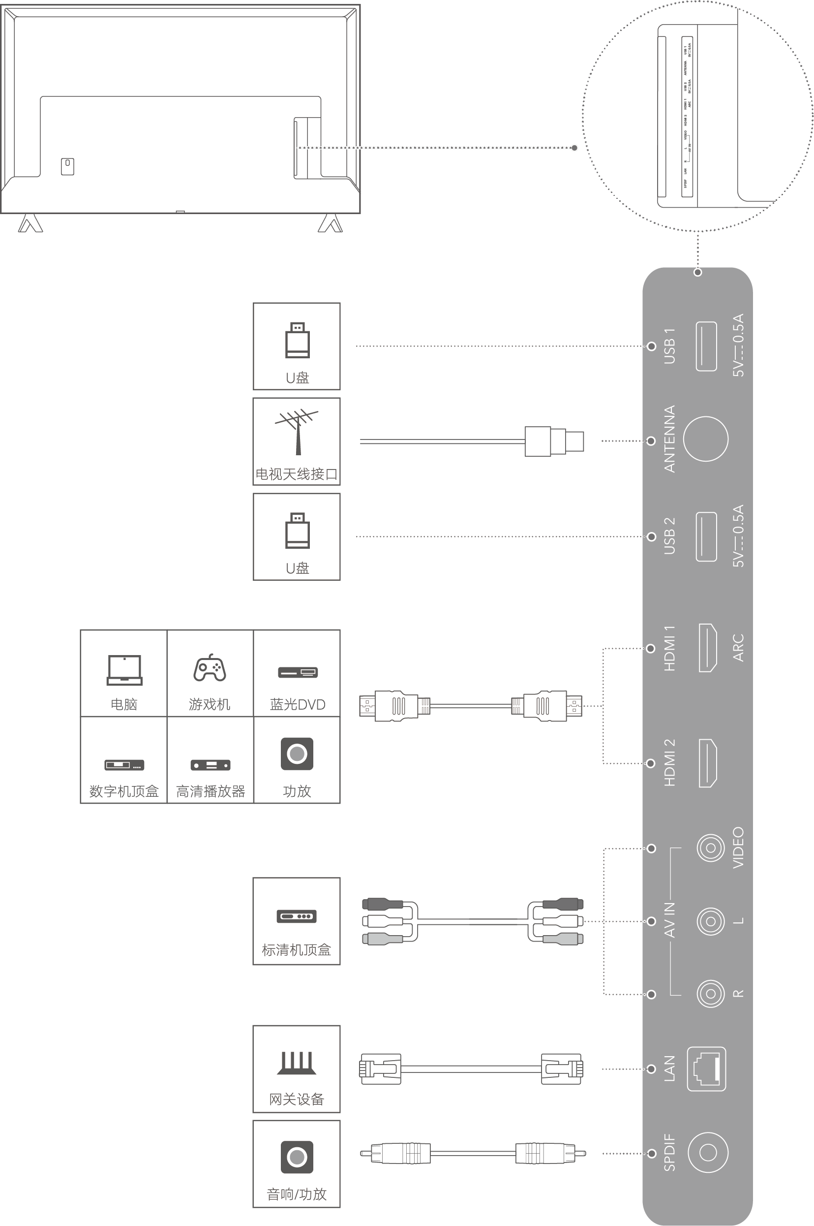 由于 HDMI1 具备 HDMI ARC 功能,一般用于连接音响设备,建议电视盒子的输出连接至智慧屏的 HDMI2 口。
