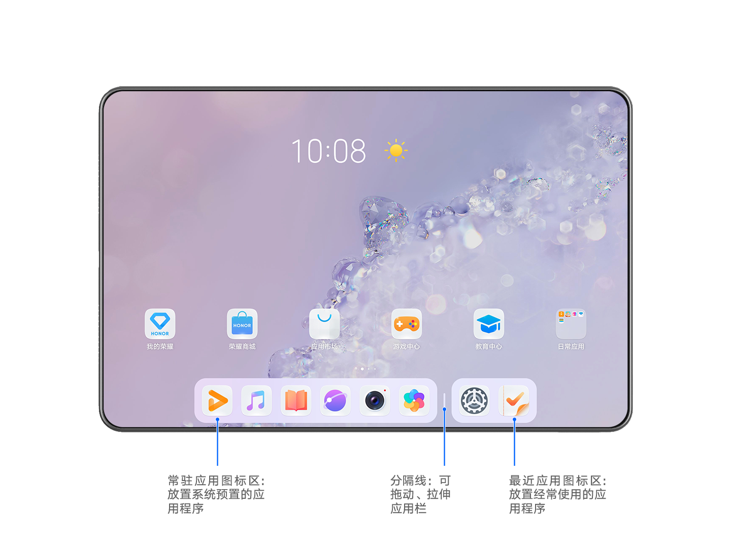 - 自定义常驻应用图标区:平板横屏和竖屏时最多可显示7个常驻应用图标。您可使用预置的常驻应用,也可根据需要添加或移除应用。常驻应用栏图标区中的应用可以全部移除,但左边应用栏不会消失。