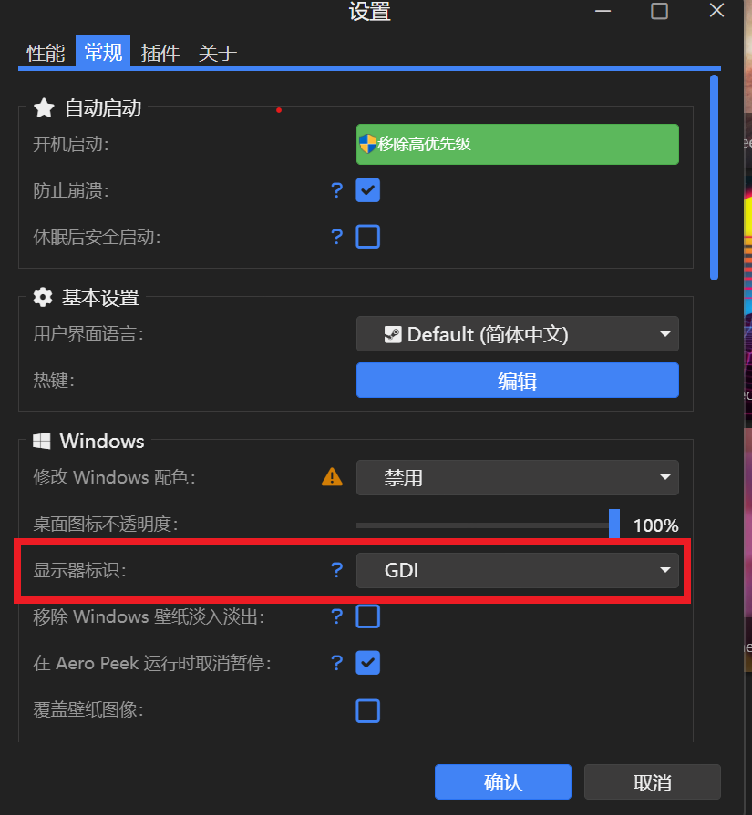 您好,请您在Wallpaper Engine设置>常规>Windows中修改显示器标识为GDI,如下图所示: