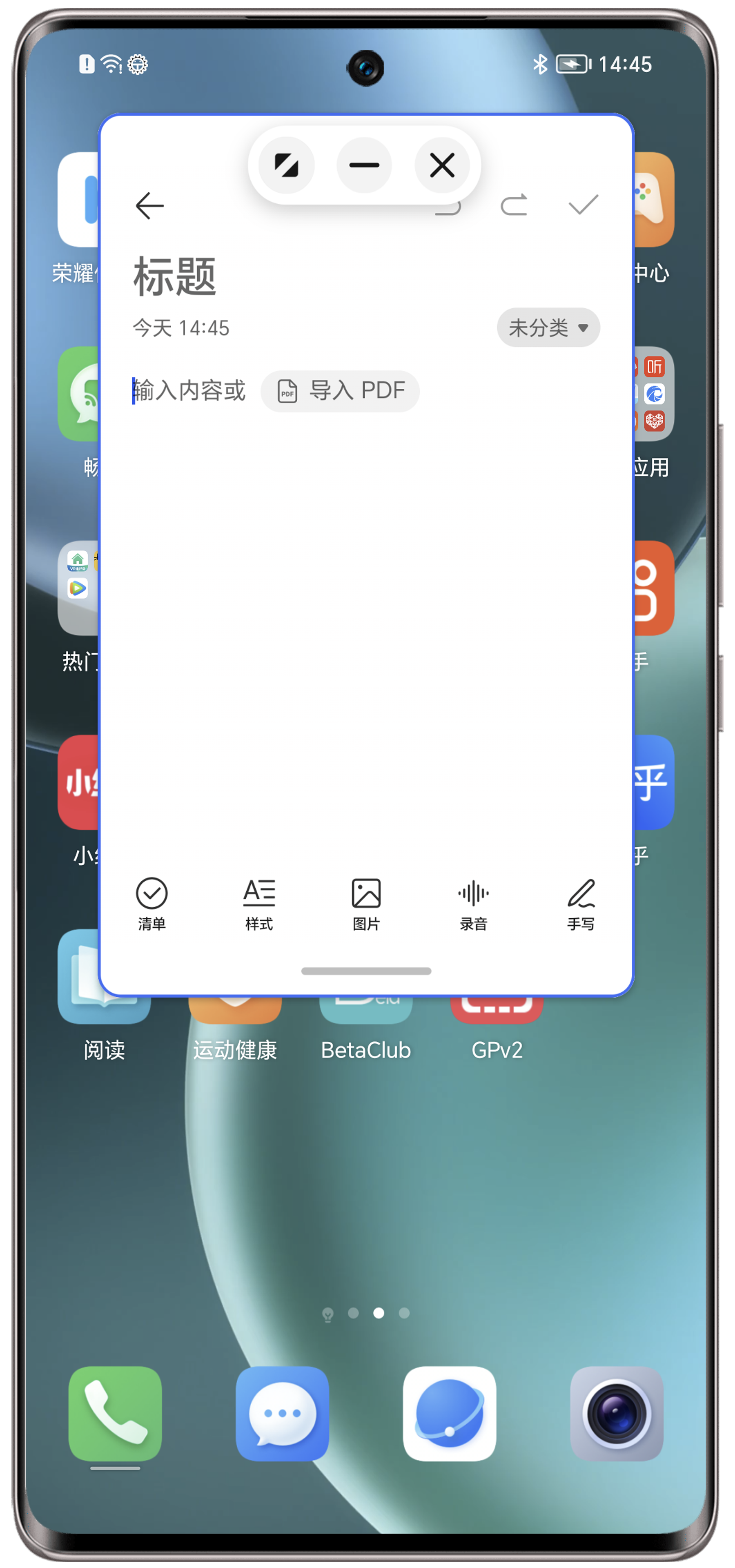 点击X或上滑悬浮窗是退出应用,如果未点击保存会导致内容丢失。
