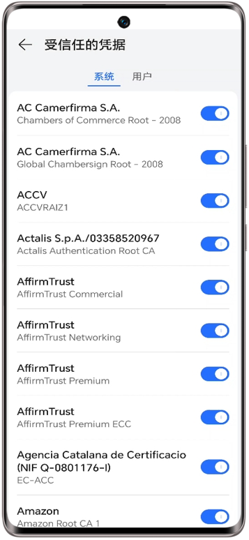 - 手机/平板进入设置>安全>更多安全设置>加密和凭据>受信任凭据,里面的开关需要全部打开。