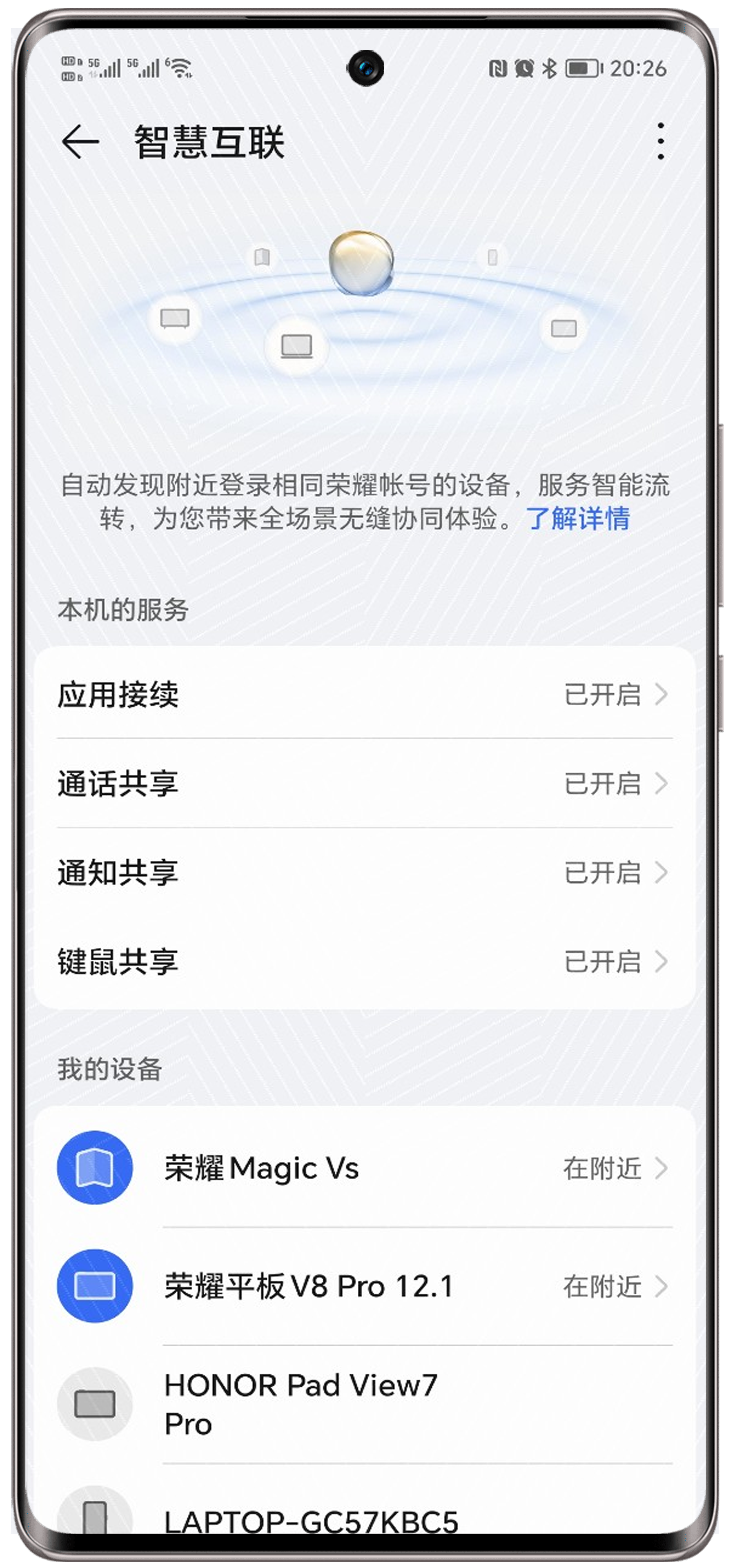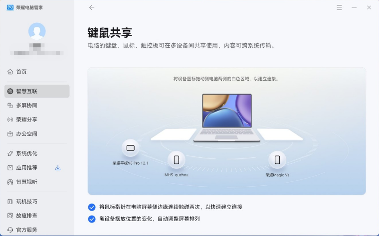 荣耀电脑管家键鼠共享界面没有显示手机或平板的设备图标