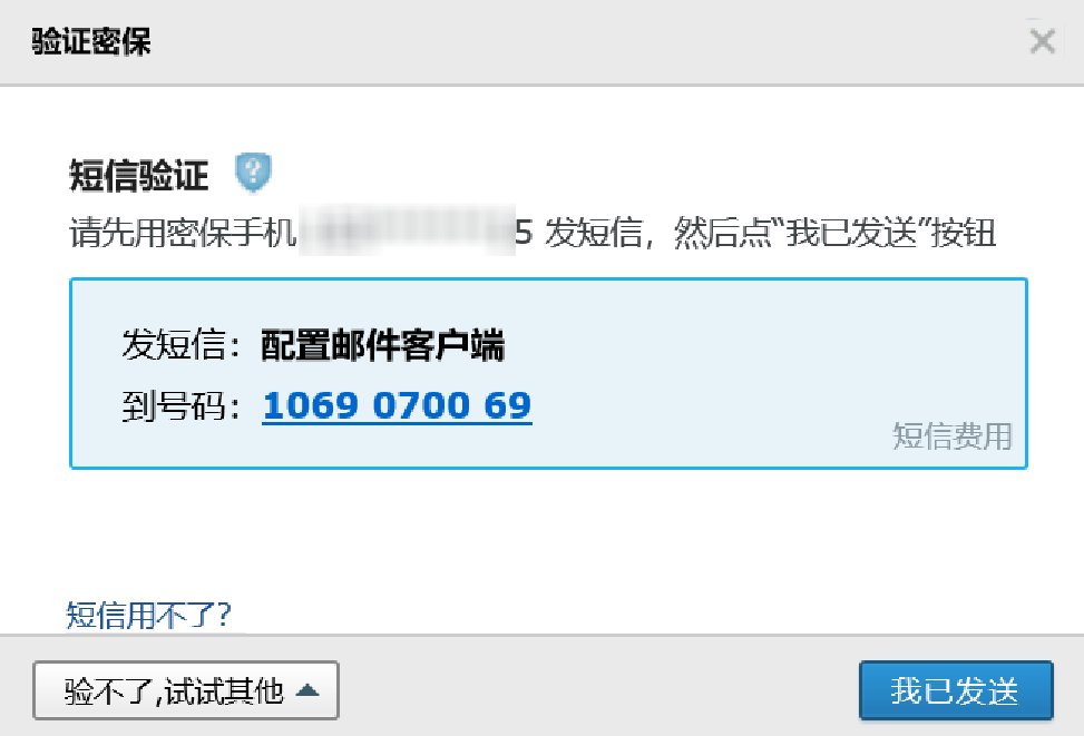 (3)若未开启,点击“开启”,会弹出“验证密保”的提示框,使用密保手机发送相关短信到指定的号码。
