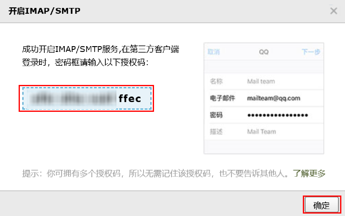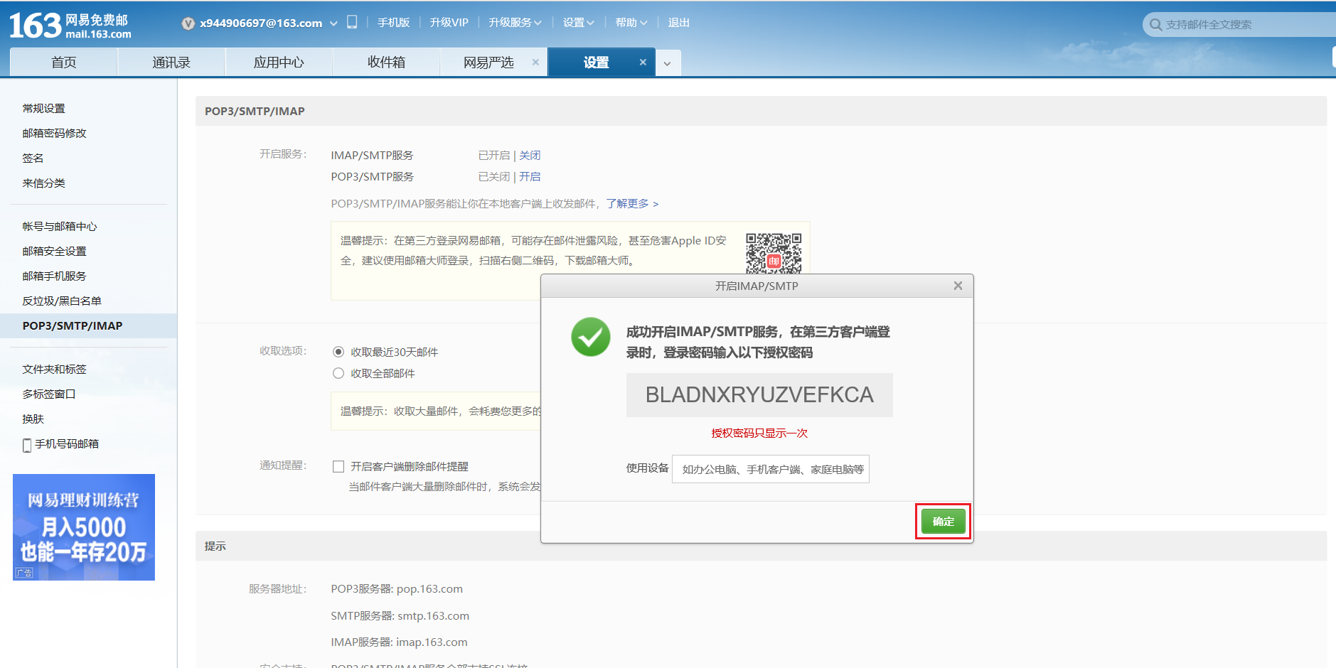 (4)成功开启IMAP/STMP服务和POP3/SMTP服务后,保存好授权密码,点击确定。