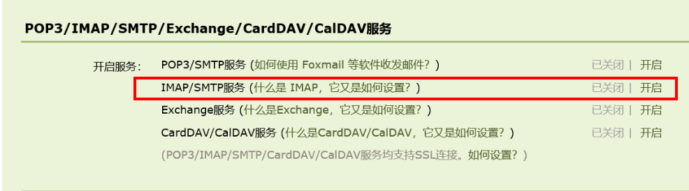 (2)在“POP3/IMAP/SMTP/Exchange/CardDAV/CalDAV服务” 中查看“IMAP/SMTP服务”是否开启。