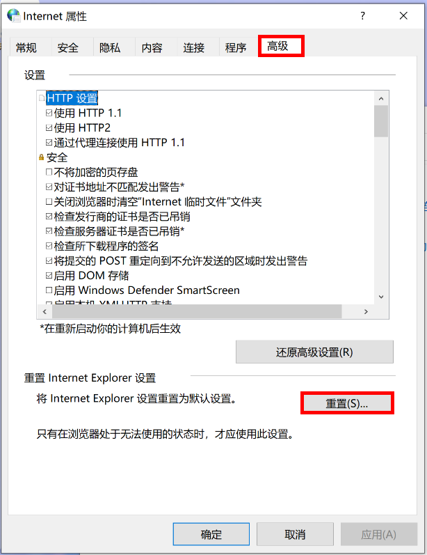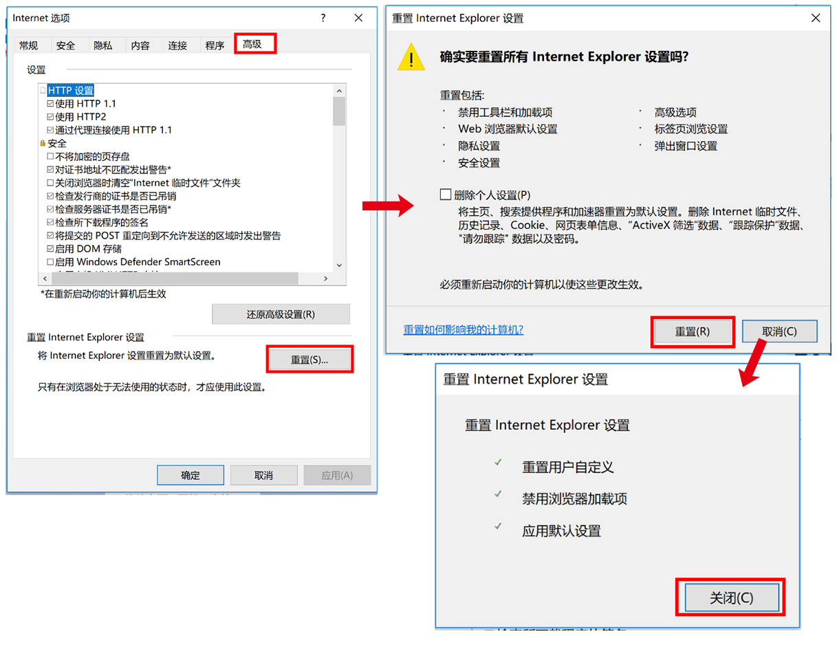 - 依次点击“高级 > 重置 > 重置 > 关闭”。
