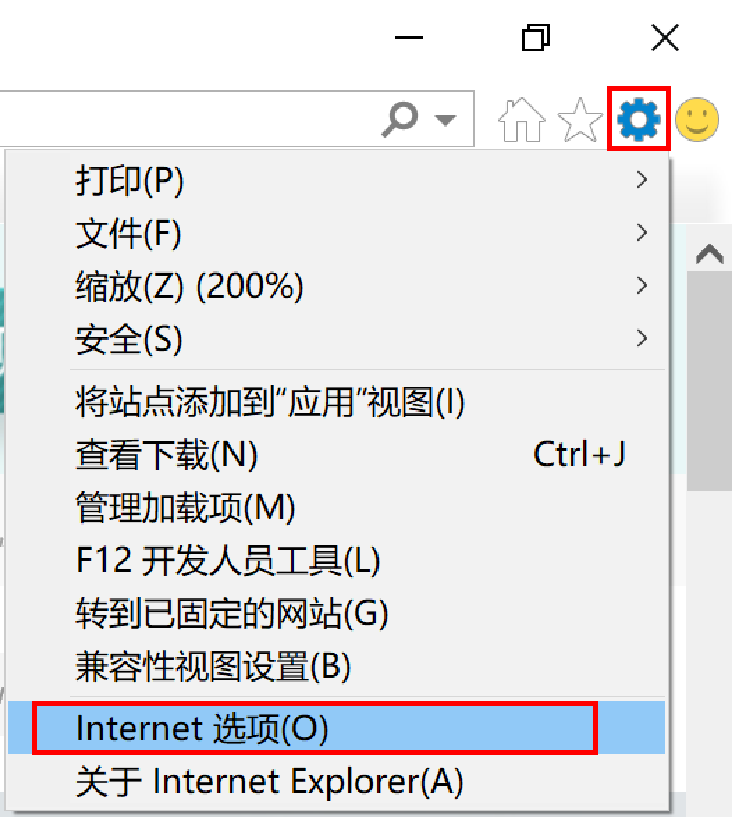 - 打开Internet Explorer 浏览器,点击右上角的设置图标,选择“Internet 选项”。