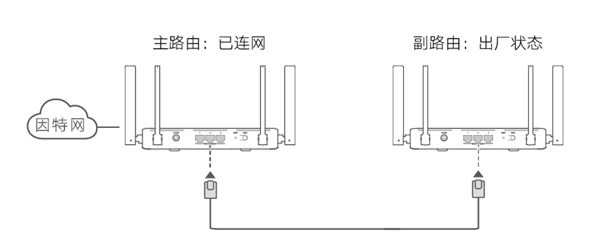 - 用网线连接主路由的任意网口和副路由的任意网口,连接后即可自动完成组网,无需您进行任何配置。