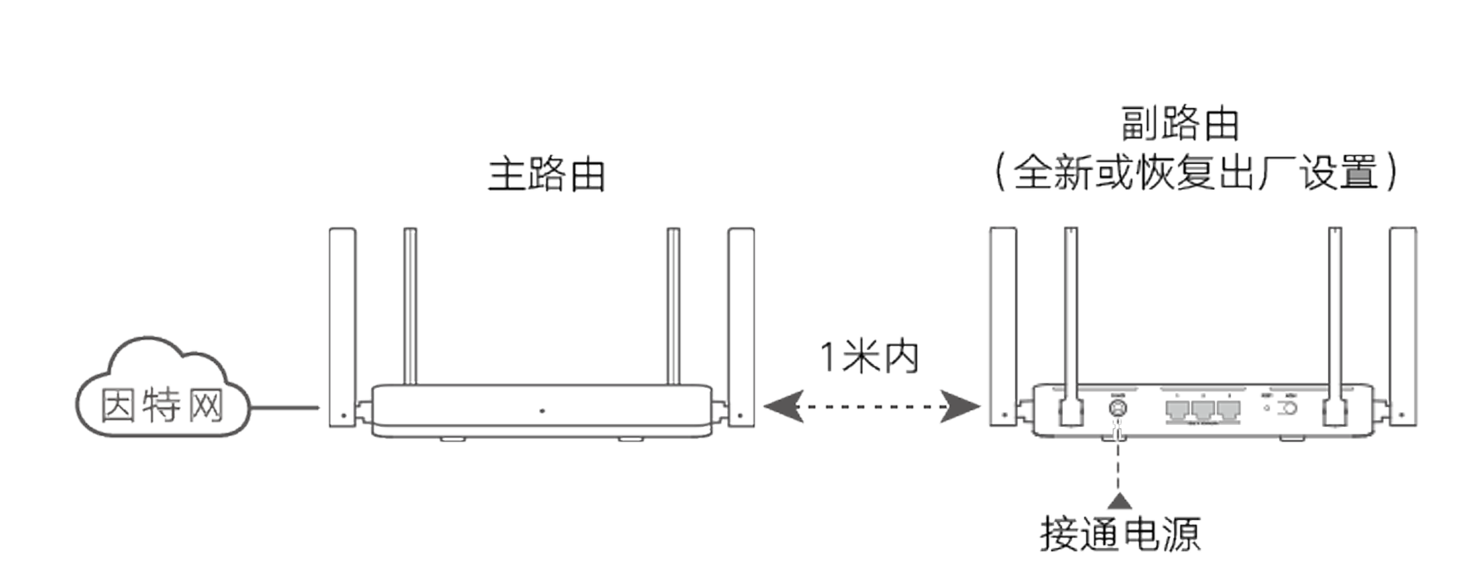 - 将副路由(全新或已恢复出厂设置)放置在主路由附近,并接通电源。