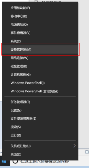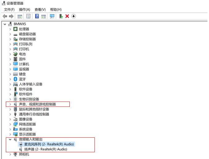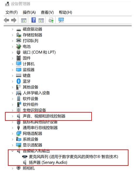 - 在开始菜单处单击鼠标右键选择“设备管理器”进入,选择“声音、视频和游戏控制器 ”“音频输入和输出”下的麦克风,查看驱动是否正常安装。
