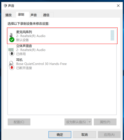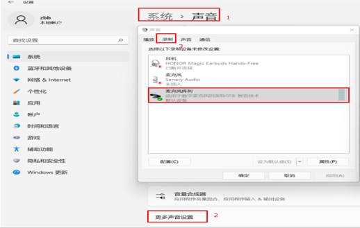 - 在系统设置>声音>更多声音设置,进入声音窗口,然后点击“录制”查看麦克是否是为默认设备。如不是,则设为默认设备。