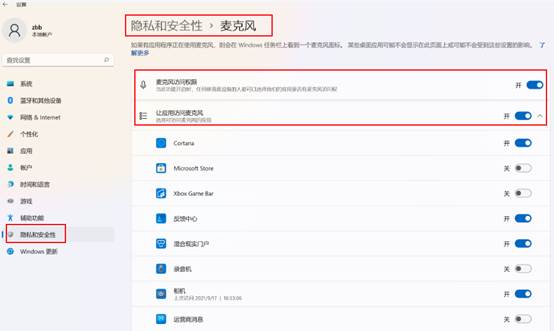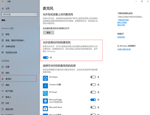 - 在开始菜单中依次点击:设置>隐私和安全性>麦克风,确定“让应用访问麦克风”项已经打开,如果没有打开,点击打开。