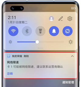 手机通知栏出现弹窗:卡1/卡2可能被网络限速,建议联系运营商确认。