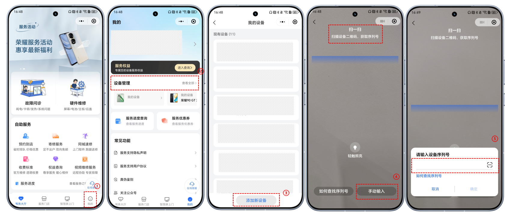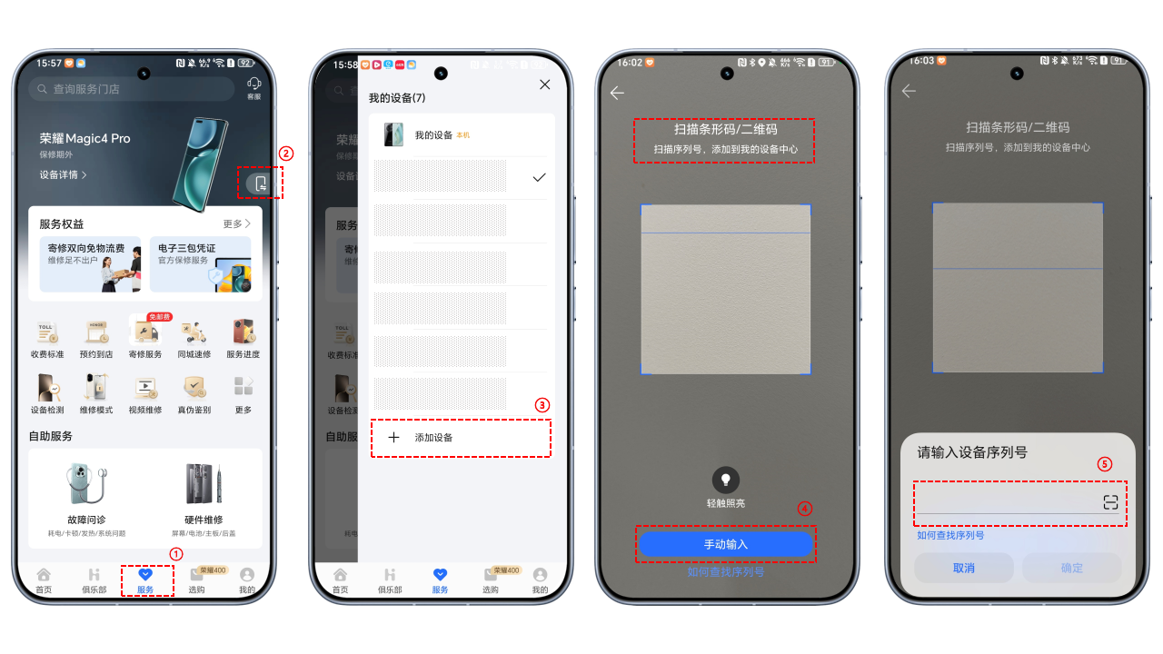 ① 我的荣耀APP:打开APP>服务>服务权益>电子三包凭证,即可查看本机保修状态及权益