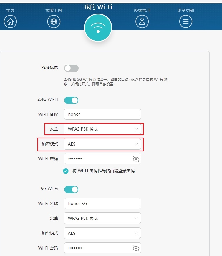 在浏览器地址栏中输入192.168.3.1访问路由器 Web 配置界面。点击我的 Wi-Fi,将安全模式修改为WPA2 PSK或WPA2 PSK/WPA3 SAE混合模式,加密方式修改为AES模式,点击保存即可。